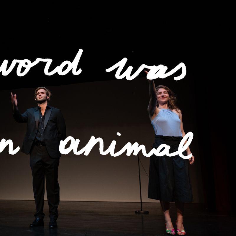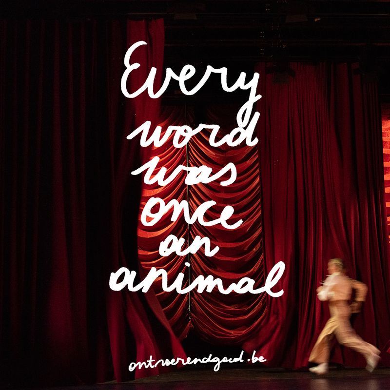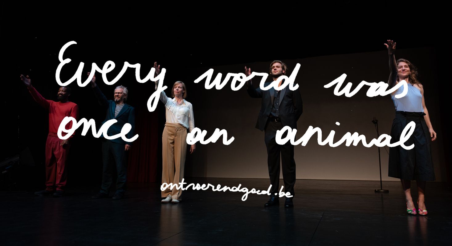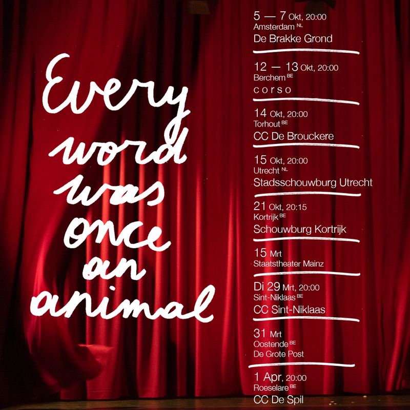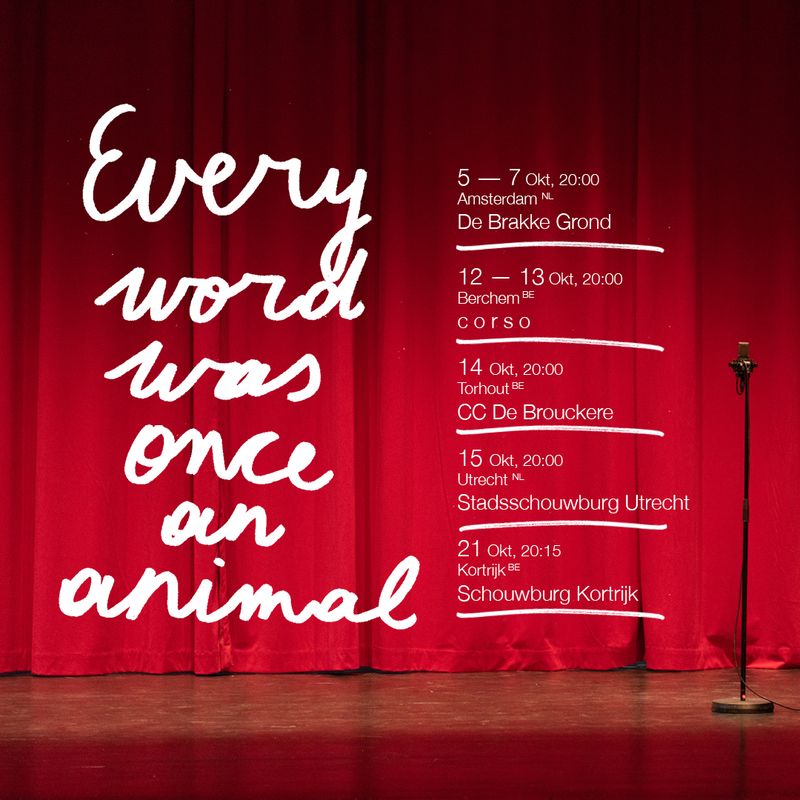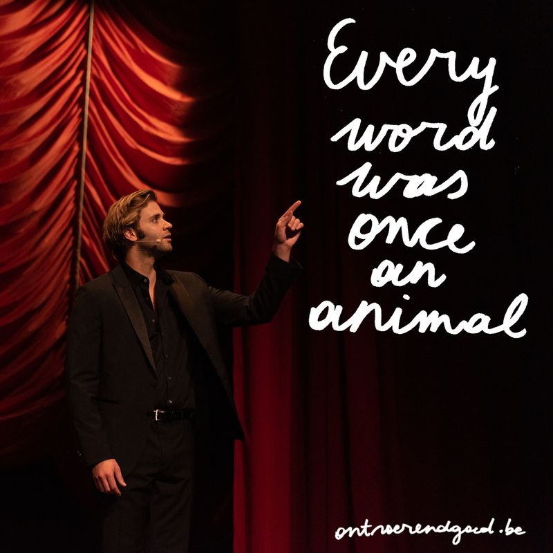 De voorstelling begint wanneer iemand opkomt, naar de microfoon stapt, de hoogte aanpast en begint te spreken. Maar zij kondigt aan dat zij niet degene is die de voorstelling zal openen, maar een van haar collega’s. Waarna die collega’s ook een voor een verschijnen en de hete aardappel steeds naar elkaar doorschuiven, is het alsof het stuk nooit écht wil beginnen. Hoe de rest van de voorstelling gaat, verklappen we niet. In ‘Every Word Was Once An Animal’ danst Ontroerend Goed op het dunne koord tussen de waarheid en een andere waarheid. Dus vergeet wat je net las. Onthoud gewoon dat een halve waarheid vaak een grote leugen is.