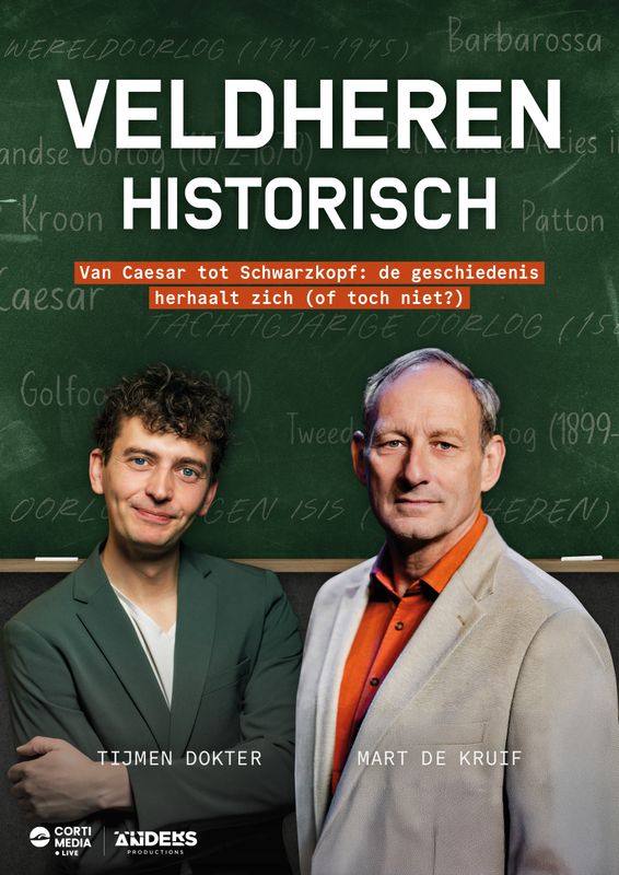 In 'Veldheren Historisch' ontmoeten generaal Mart de Kruif en reservist Tijmen Dokter elkaar op het toneel. Na het succes van hun populaire podcast bespreken de twee bevlogen verhalenvertellers de oorlogen die de wereld hebben gevormd – en de actuele dreigingen die voor ons liggen. De centrale vraag: wordt het ook hier oorlog? En belangrijker nog: kunnen we, gewapend met de lessen van het verleden, begrijpen wat ons te wachten staat?